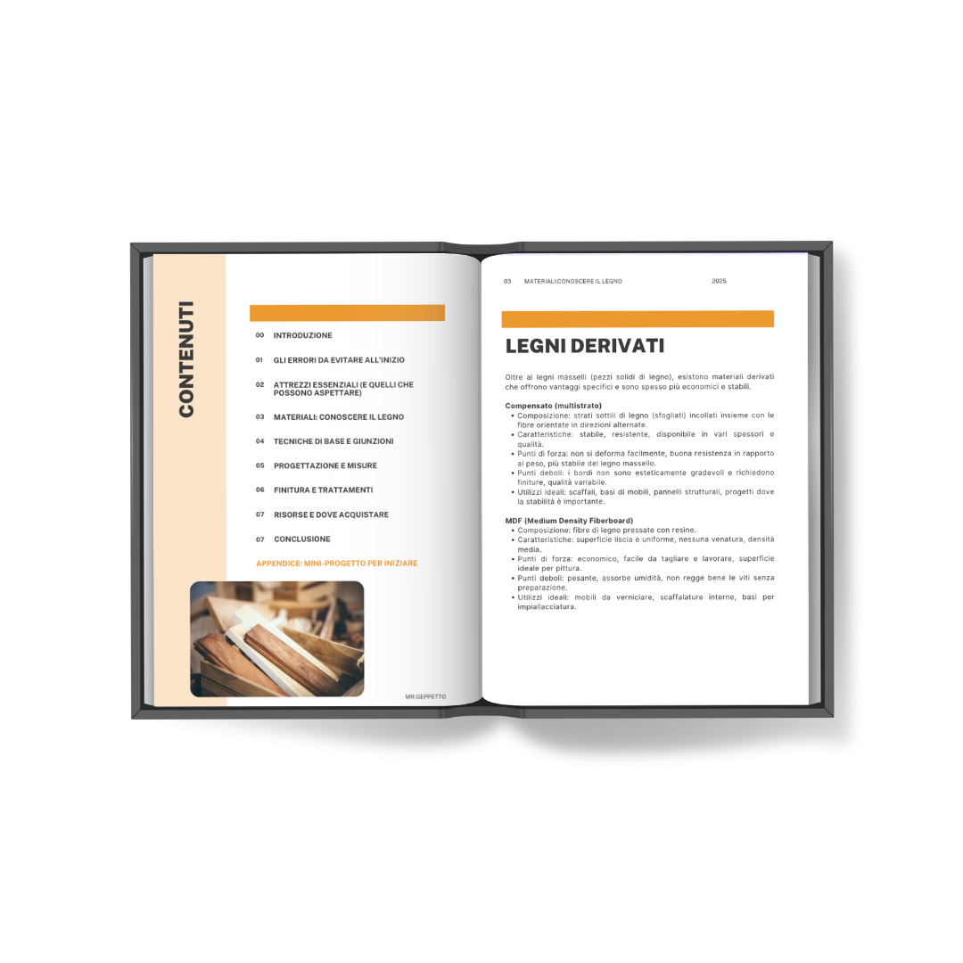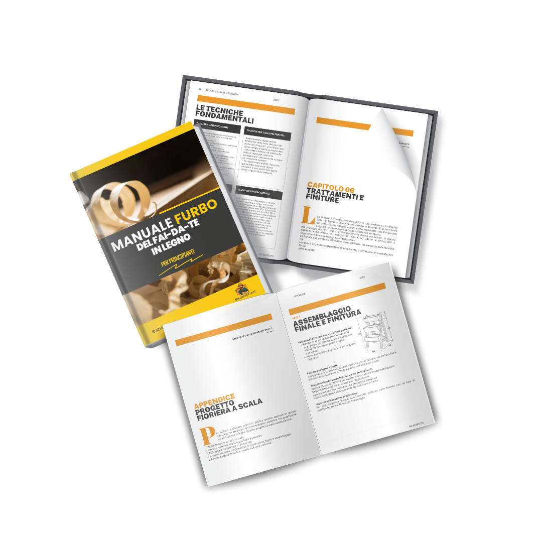 Un manuale in formato PDF di 56 pagine illustrate, pensato per chi vuole iniziare a costruire oggetti in legno senza stress, confusione o errori.